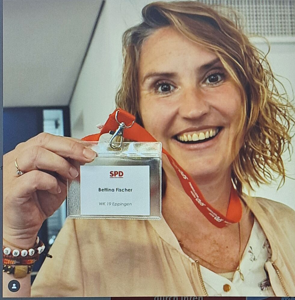 Am 25.Mai 2025 wurde Bettina Fischer für den Wahlkreis Eppingen im Landkreis Heilbronn zur SPD Kandidatin in Stuttgart gewählt, hier ein Foto das sie sehr glücklich zeigt nun heißt es anpacken und alles geben für die Landtagswahl in BaWü im März 2026. Alle SPD Mitglieder sollen sich wenn möglich produktiv einbringen um unsere KANDIDATIN nach Stuttgart zu bringen wir brauchen jede Sozialdemokratin und Sozialdemokraten der Wahlkampf beginnt bald.