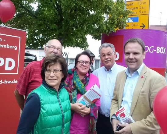 Ingo Rust mit den beiden SPD Kandidatinnen für den Kreistag Wahlkreis Schwaigern-Leingarten-Massenbachhausen Andrea Vollmer & Hildegard Kneersowie den beiden Gemeinderatskandidaten Dieter Peter & Albrecht Fauser beim gemeinsamem Infostand in Massenbachhausen.