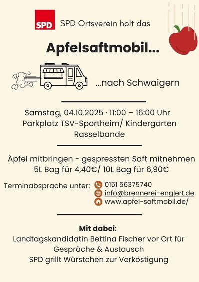 Das Apfelsaftmobil kommt nach Schwaigern . Gerne am 04.10.2025 zwischen 11.00 Uhr - 16.00 Uhr am Parkplatz des TSV - Sportheim / Kindergarten Rasselband einfinden um eure Äpfel in frischen Saft pressen zu lassen, den ihr dann anschließend mitnehmen könnt. Ich würde mich auf jeden Fall über euch alle sehr freuen.